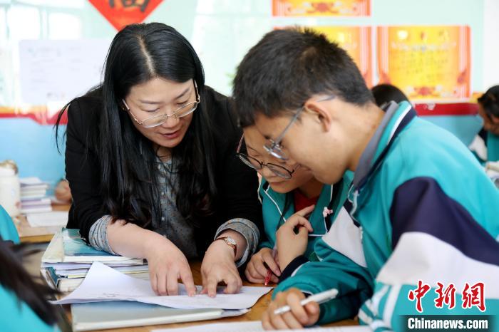 圖為江蘇援青教師王景花在青海省海南藏族自治州高級(jí)中學(xué)輔導(dǎo)學(xué)生。張?zhí)砀?攝