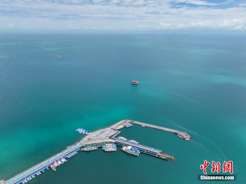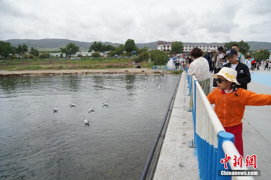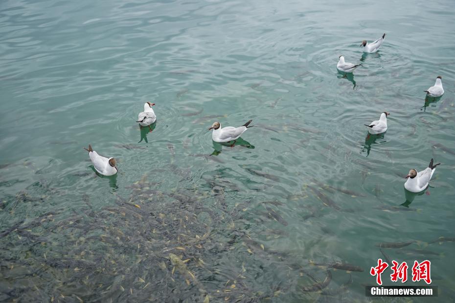 7月8日,青海省海南藏族自治州共和縣青海湖二郎劍景區(qū)內(nèi),“魚鳥共生”的生態(tài)景象。中新社記者 馬銘言 攝