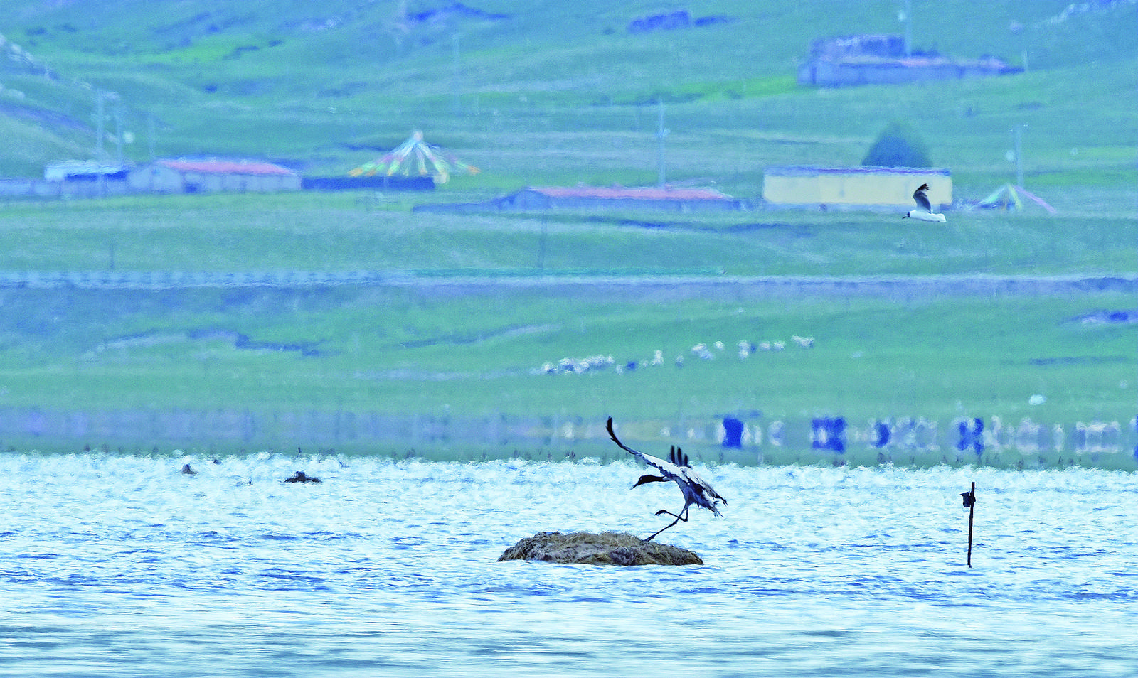 多杰措毛是泉灣保護站的一名生態(tài)管護員,在泉灣濕地尕日拉區(qū)域內(nèi),用望遠鏡觀察湖面上一對正在孵育幼鳥的黑頸鶴,她回憶起今年跟著當(dāng)?shù)丨h(huán)保人士給黑頸鶴筑巢修巢的場景。