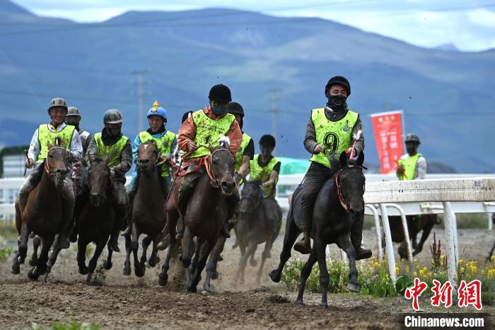 7月30日,四川理塘,比賽現(xiàn)場(chǎng)9號(hào)選手(右一)暫時(shí)領(lǐng)先。中新社記者 劉忠俊 攝