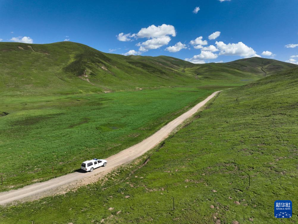 7月31日,青海省果洛藏族自治州達日縣窩賽鄉(xiāng)衛(wèi)生院醫(yī)療巡回車前往牧民夏季草場開展公共衛(wèi)生服務(wù)(無人機照片)。新華社記者 張龍 攝