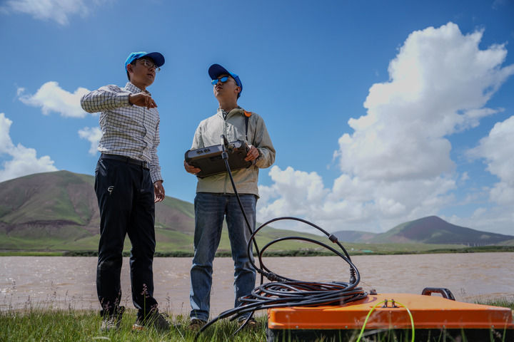 在長江南源當曲源,科考隊員在進行流速測量(2024年7月22日攝)。新華社 潘彬彬 攝
