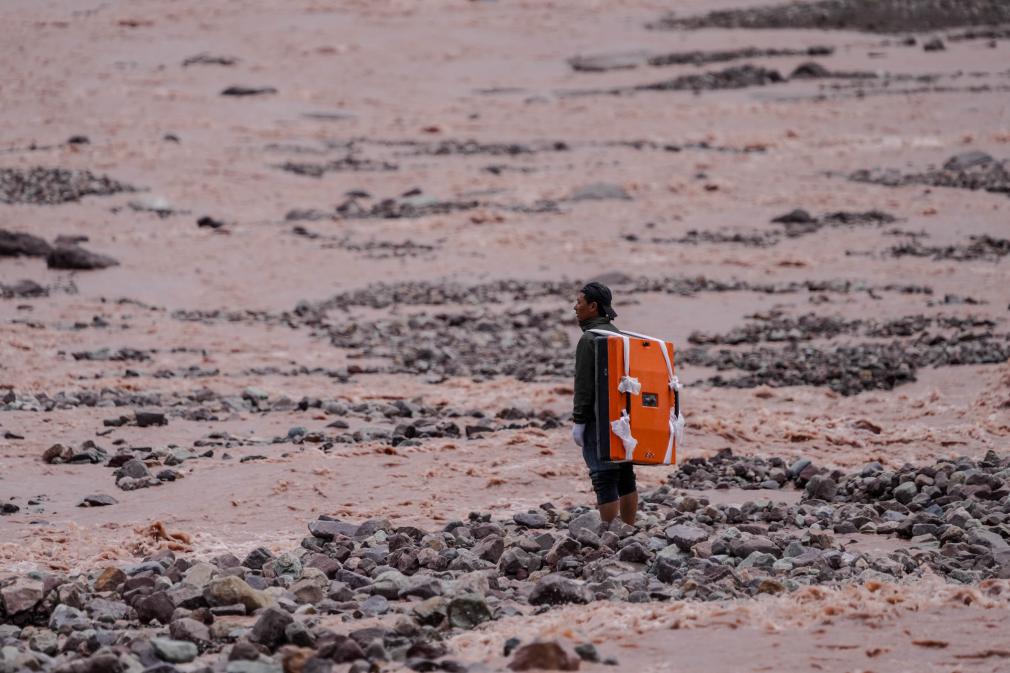 7月25日,在冬克瑪?shù)妆ǎ瓶缄?duì)員準(zhǔn)備蹚水過(guò)河。新華社 杜笑微 攝