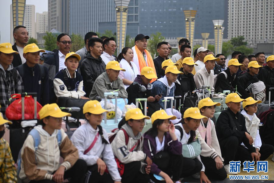 學(xué)生及家長(zhǎng)、老師在西寧火車站站前廣場(chǎng)合影。新華社記者 張龍 攝