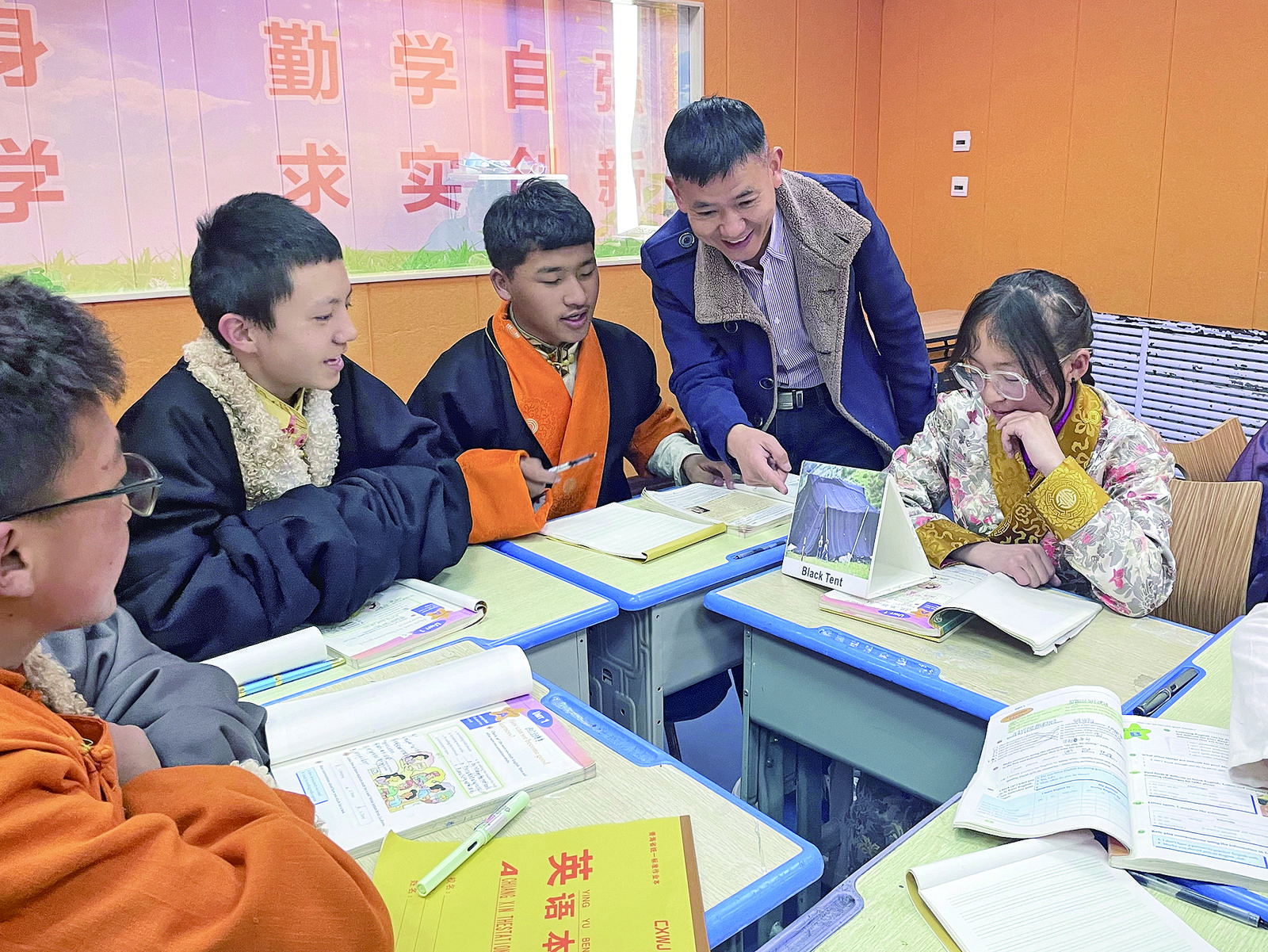 上海第五批援青團(tuán)隊(duì)成員,果洛州民族高級(jí)中學(xué)英語工作室主持人、高三教師芮學(xué)國,為學(xué)生輔導(dǎo)英語課程。上海第五批援青團(tuán)隊(duì)供圖