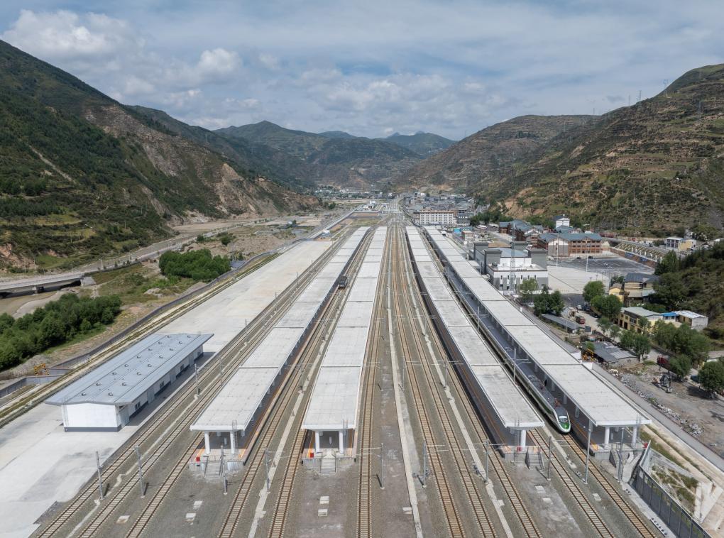 一輛調(diào)試列車??吭诖ㄇ噼F路松潘站(8月29日攝)。新華社記者 江宏景 攝