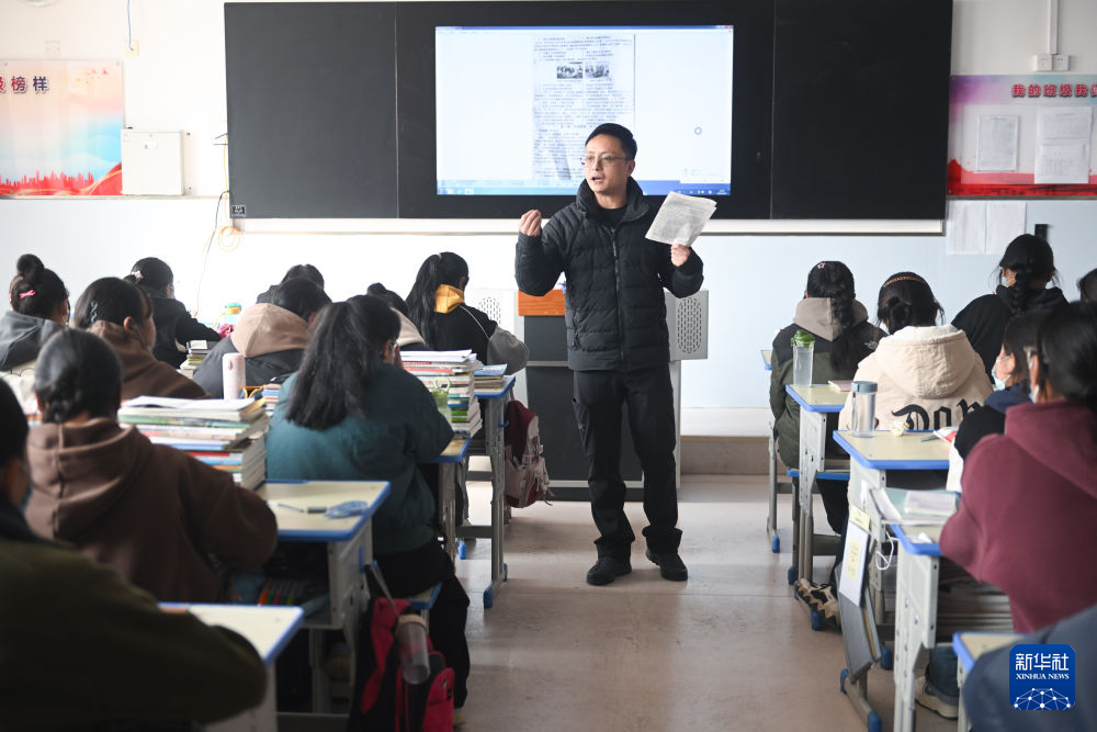 2023年2月23日,援青教師鐘祖華在青海省西寧市城北區(qū)的西寧果洛中學(xué)給學(xué)生上課。新華社記者 張龍 攝
