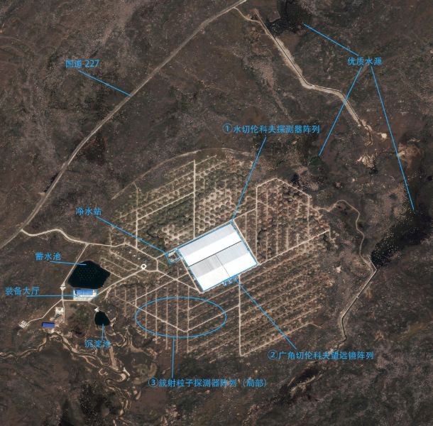 從衛(wèi)星影像示意圖上可以看到,“拉索”毗鄰國道,地勢整體平坦,優(yōu)質水源豐富。得益于世界屋脊的高海拔優(yōu)勢和多項關鍵核心技術的突破,“拉索”集合了三項“世界之最”:最靈敏的超高能伽馬射線探測裝置,最靈敏的甚高能伽馬射線源巡天普查望遠鏡,能量覆蓋范圍最寬的超高能宇宙線復合式立體測量系統(tǒng)。自2021年“拉索”完成建設投入使用以來,成績斐然。