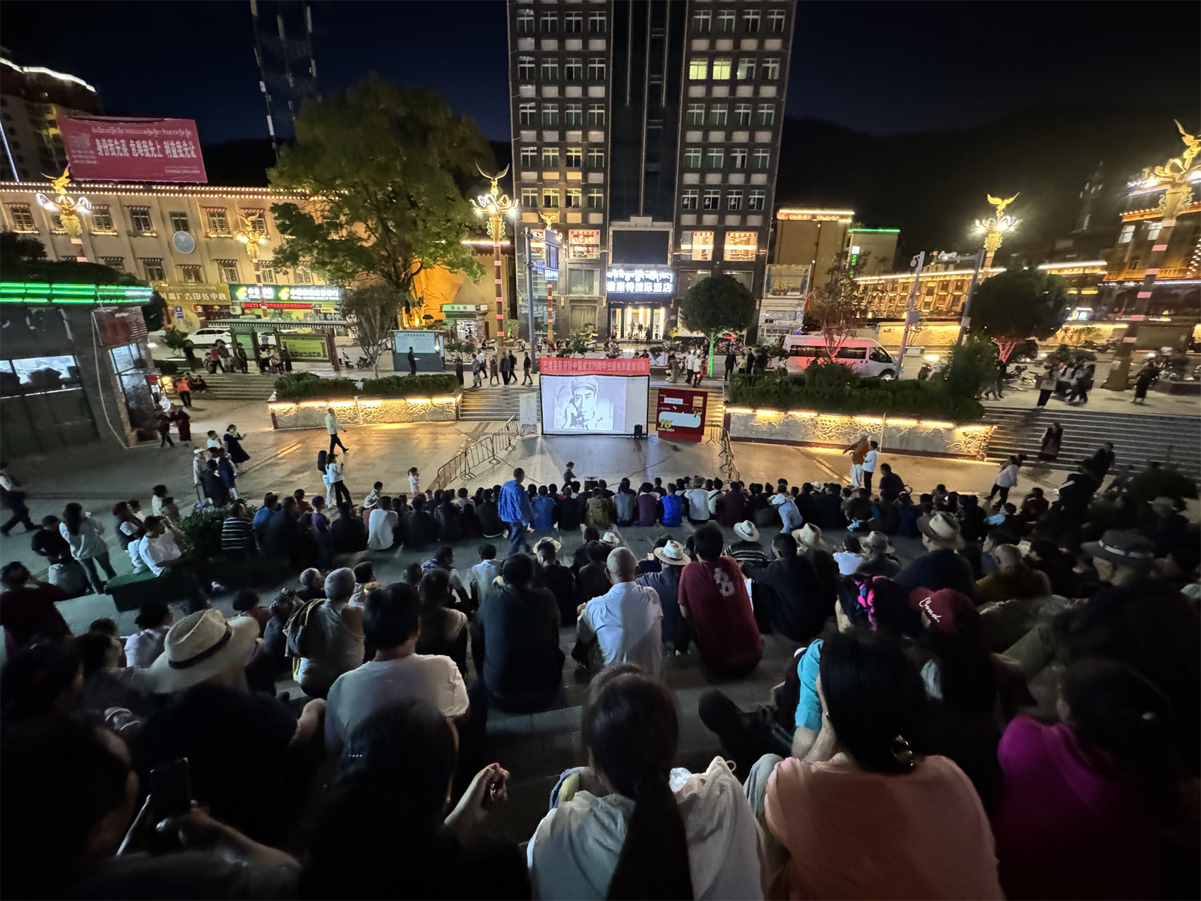 “吃過晚飯就來廣場等著了,好久沒看過壩壩電影,今天帶著小孩來感受一下。”巴塘縣市民翁吉說。夜幕降臨,巴塘縣中山廣場早早地聚集了眾多滿懷期待的市民。一塊巨大的白色幕布在廣場中央拉起,仿佛在訴說著一個(gè)個(gè)精彩的故事。工作人員們忙碌地調(diào)試著設(shè)備,為即將開始的電影放映做著最后的準(zhǔn)備。