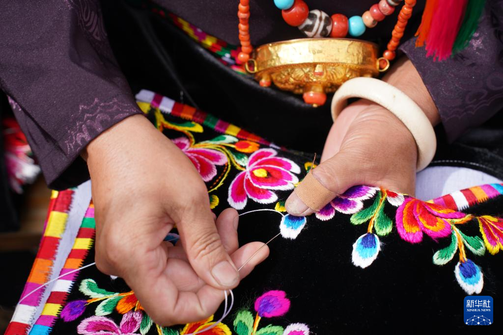 10月12日,嘉絨藏族刺繡甘孜州非遺傳承人阿姆在四川省丹巴縣巴底鎮(zhèn)色足村繡花。新華社 呂明響 攝