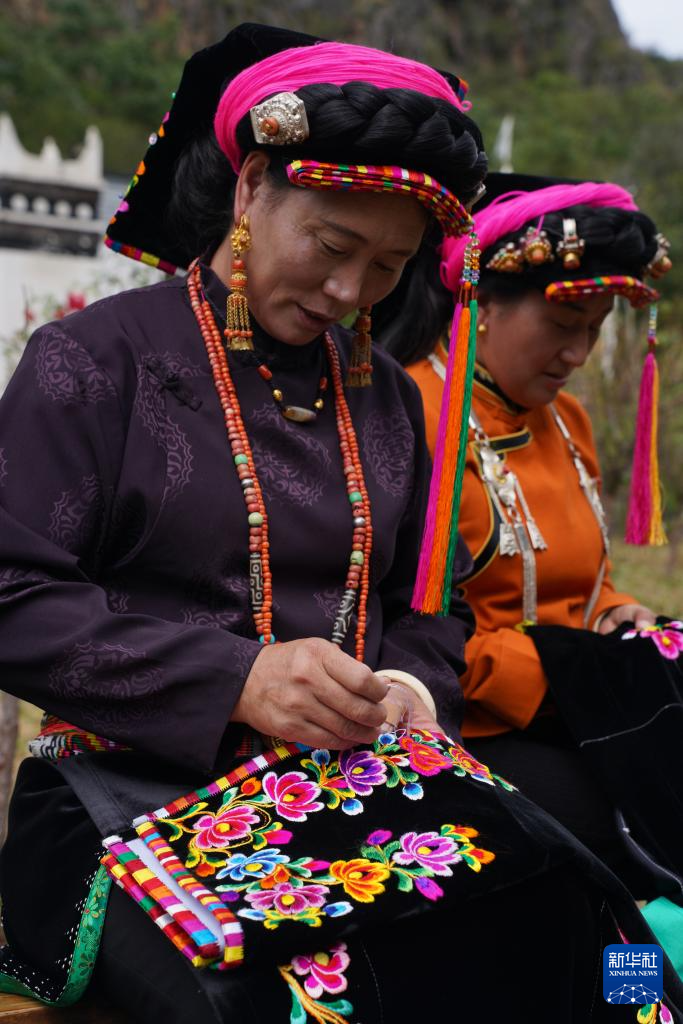 10月12日,嘉絨藏族刺繡甘孜州非遺傳承人阿姆(左)和徒弟安初在四川省丹巴縣巴底鎮(zhèn)色足村繡花。新華社 呂明響 攝