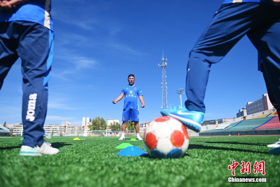 10月15日,在甘肅省甘南藏族自治州合作市一足球場(chǎng)內(nèi),甘南九二聯(lián)隊(duì)隊(duì)長(zhǎng)久西道杰進(jìn)行帶球培訓(xùn)。為了比賽經(jīng)費(fèi),今年38歲的久西道杰作為隊(duì)長(zhǎng)帶領(lǐng)球隊(duì)多次登門拜訪各單位與企業(yè),并且嘗試“自我造血”開啟直播帶貨賣球衣、球鞋等體育用品來(lái)籌集經(jīng)費(fèi)。