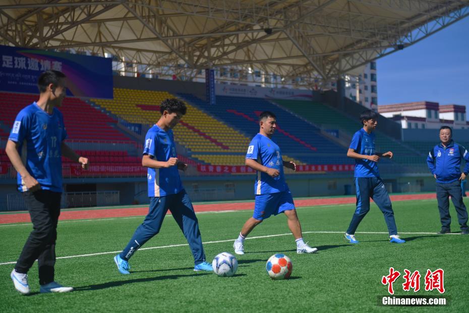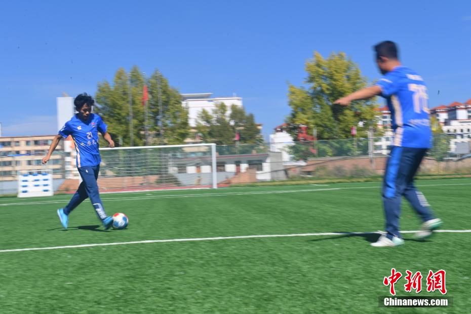 10月15日,在甘肅省甘南藏族自治州合作市一牧場(chǎng)內(nèi),甘南九二聯(lián)隊(duì)足球隊(duì)員進(jìn)行訓(xùn)練。該足球隊(duì)已成立32年,由牧民、務(wù)工者、歌舞演員、個(gè)體戶、老師、學(xué)生等組成,如今已歷經(jīng)三代球員的成長(zhǎng)。