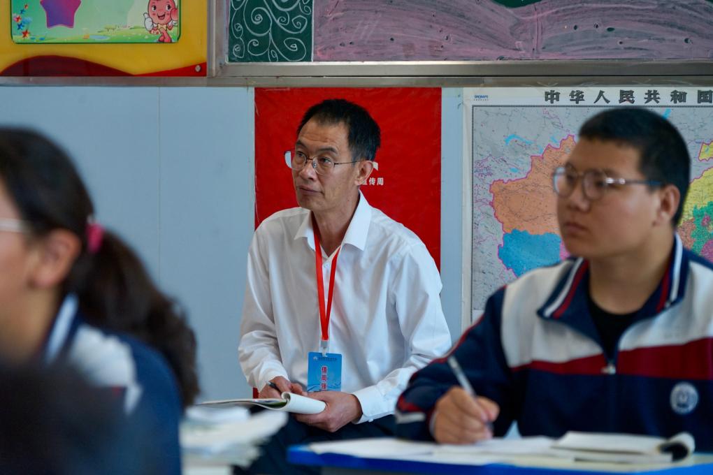 上海援青干部、果洛西寧民族中學校長常途在課堂旁聽。新華社記者 張子琪 攝