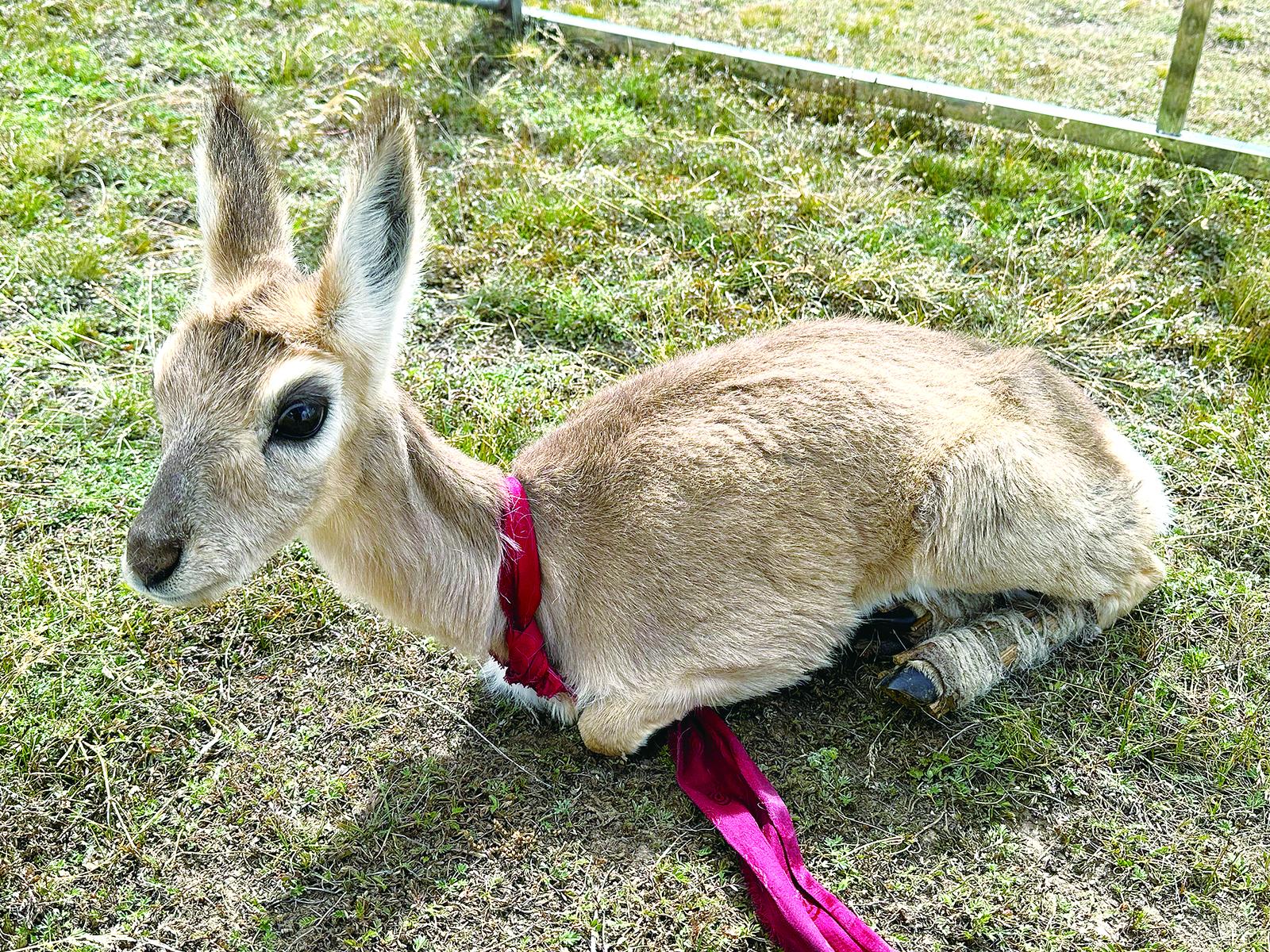 “藏原羚兩只后腿站不起來,我們?cè)噲D靠近,但它掙扎得更厲害了?!奔友蚨嘟芎捅緩?qiáng)脫下自己的外套,給藏原羚披上,遮住它的眼睛,等到不再掙扎便輕輕抱起帶去縣上醫(yī)治。