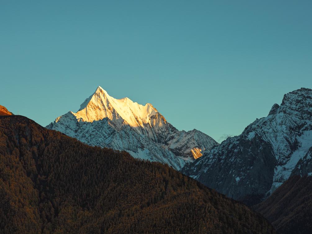 夏諾多吉雪山呈現(xiàn)日照金山景觀。新華社記者 薛晨 攝