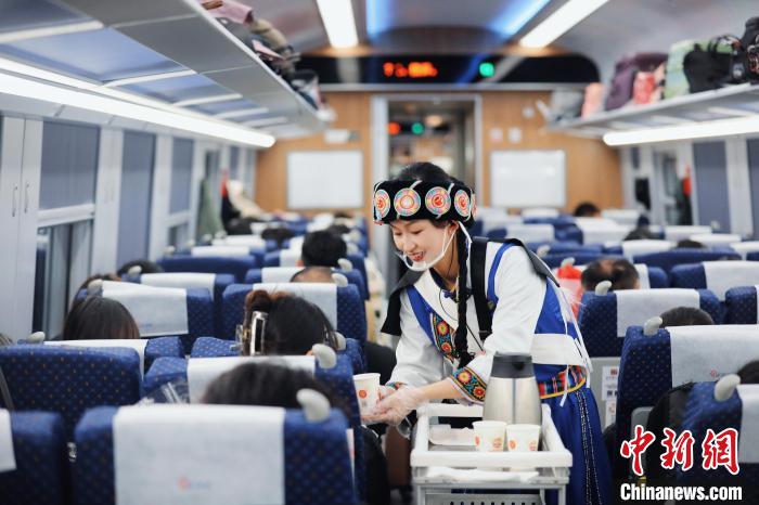 圖為乘務員為乘客送上酥油茶。楊紫軒 攝