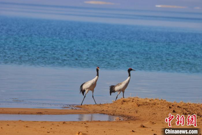 圖為黑頸鶴在青海湖畔休閑漫步。青海湖景區(qū)保護(hù)利用管理局供圖