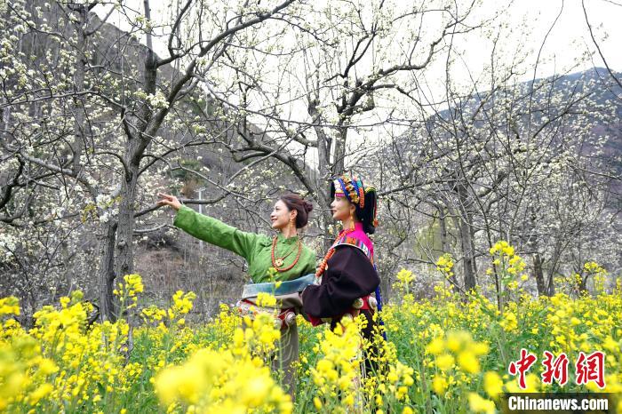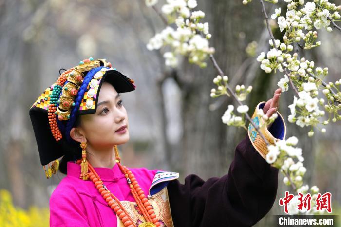 圖為藏族姑娘在梨樹間賞花。中新社記者 安源 攝