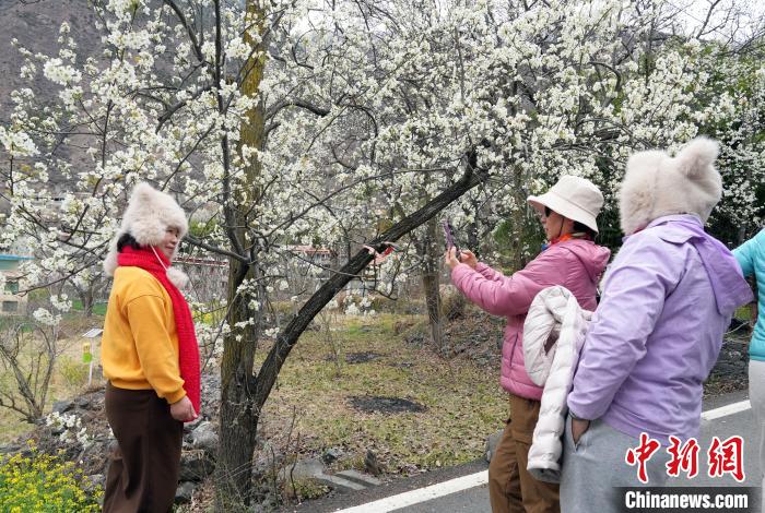 圖為游客在梨樹下拍照。中新社記者 安源 攝