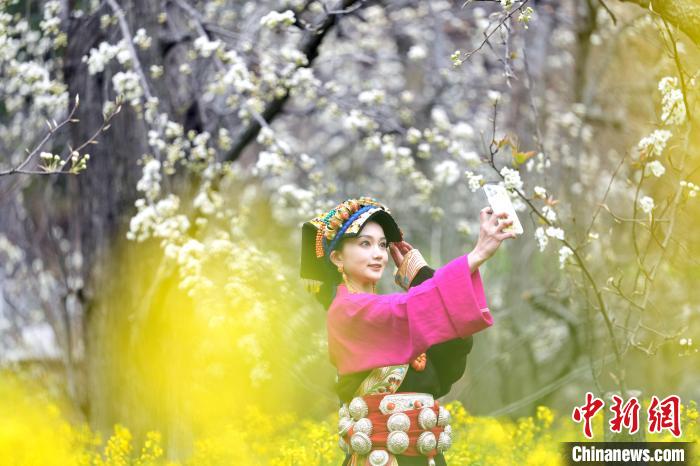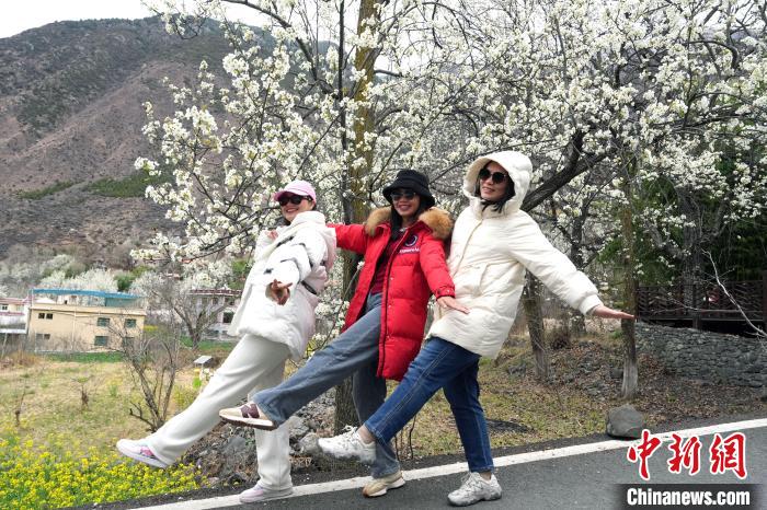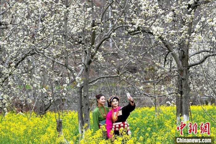 圖為藏族姑娘在梨樹下拍照。中新社記者 安源 攝