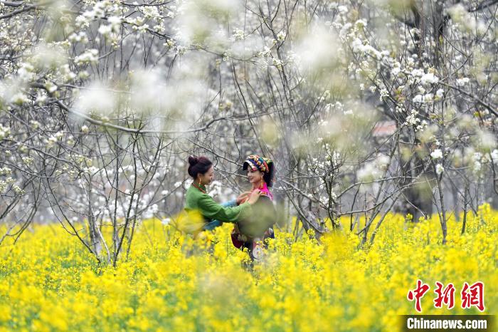圖為藏族姑娘在梨樹下玩耍。中新社記者 安源 攝