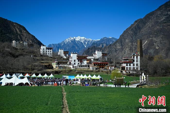 3月25日,四川丹巴,中路藏寨海子坪田野上的音樂(lè)會(huì)吸引了不少村民或游客。(無(wú)人機(jī)照片)中新社記者 劉忠俊 攝
