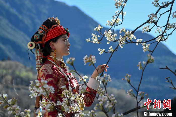 3月25日,四川丹巴,梨花樹(shù)下的丹巴女孩。中新社記者 劉忠俊 攝