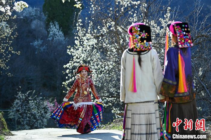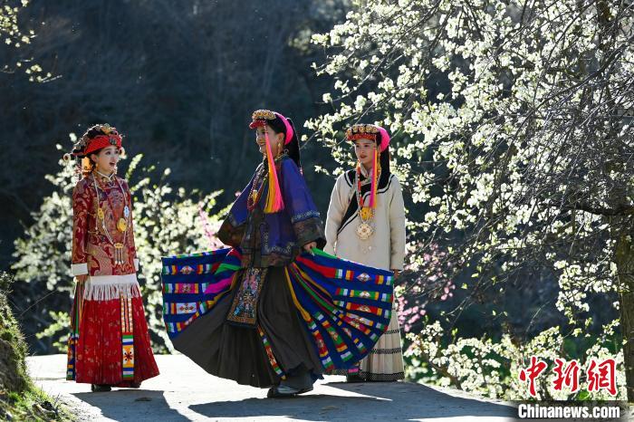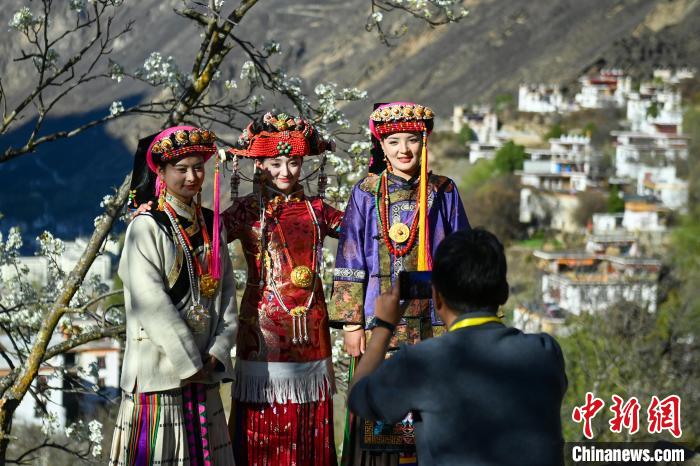 3月25日,四川丹巴,身著漂亮民族服飾的丹巴女孩們?cè)诶婊?shù)下合影拍照。中新社記者 劉忠俊 攝