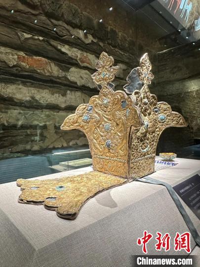 2019年,考古人員在發(fā)掘過(guò)程中,意外發(fā)現(xiàn)了一個(gè)隱藏在墓室外壁的暗格。暗格內(nèi)放置著一件珍珠冕旒龍鳳獅紋銀飾金王冠和一件鑲嵌綠松石四曲鋬指金杯。兩件文物制作精美、工藝精湛,對(duì)研究青海地區(qū)多民族多元文化交往交流交融具有重大意義。