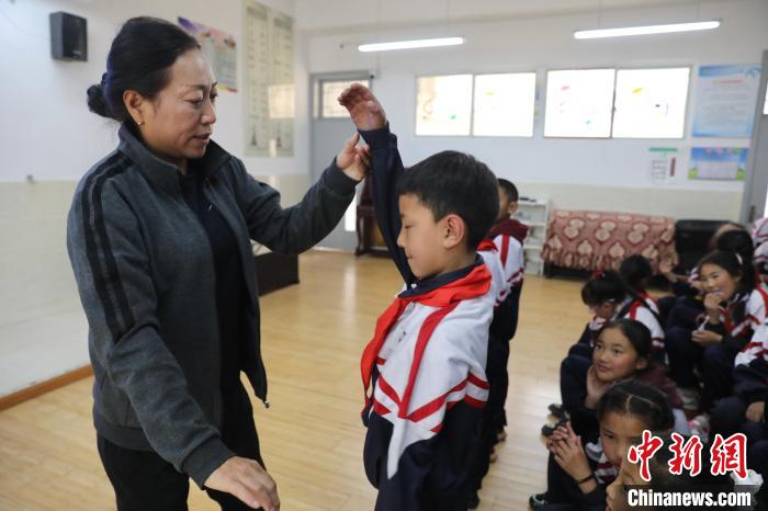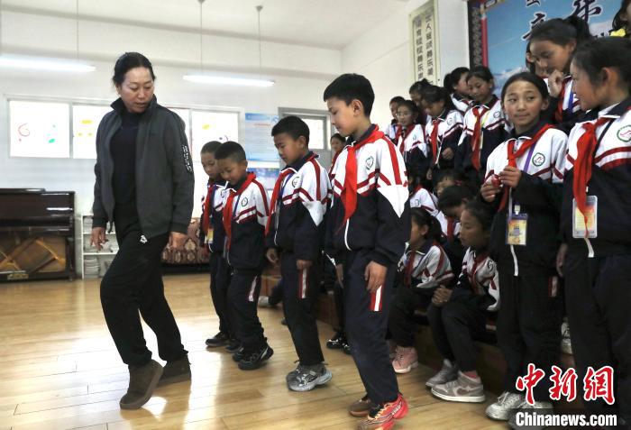 圖為音樂老師胡嗣梅為合唱團(tuán)成員示范巴塘弦子舞動作。中新社記者 王磊 攝