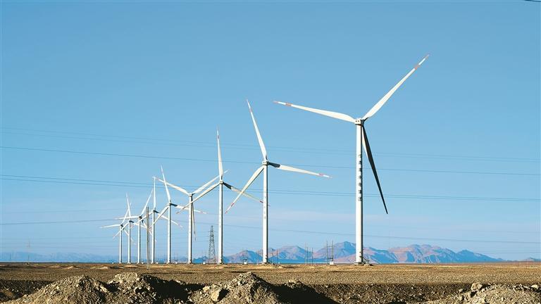碧藍(lán)天空下,潔白的風(fēng)力發(fā)電機(jī)高高聳立。陳陽 攝
