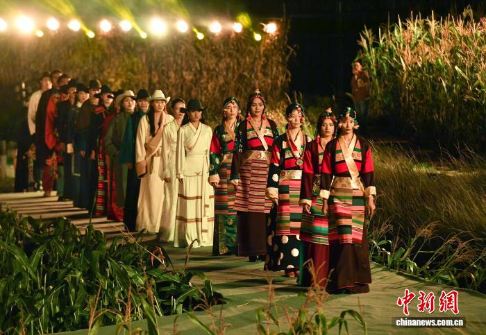 在四川省甘孜藏族自治州鄉(xiāng)城縣青德鎮(zhèn)白龔村,玉米田間的一塊空地被改造成露天T臺(tái)。不遠(yuǎn)處,一座座白藏房靜靜矗立于夜色,凝視著這片歡騰的土地。20日晚,一場(chǎng)別開(kāi)生面的田園“瘋”裝秀,就在這寧?kù)o而熱烈的氛圍中上演。