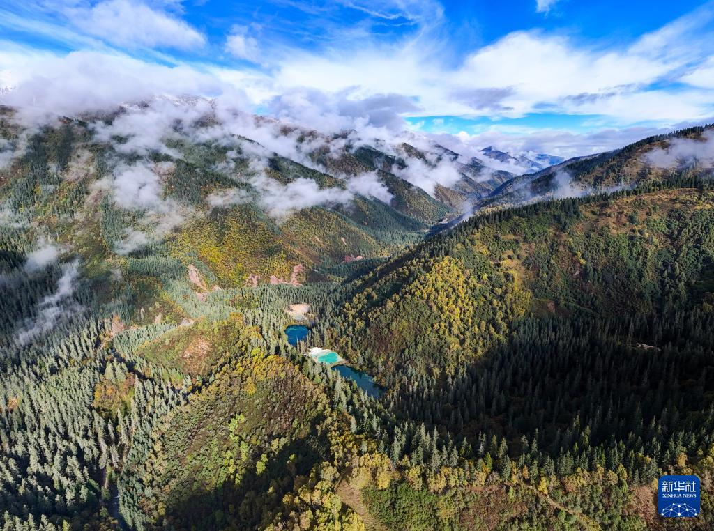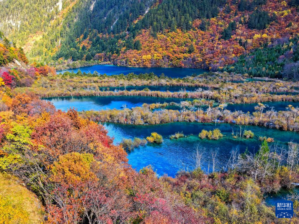 這是2024年10月12日拍攝的九寨溝縣神仙池景區(qū)內(nèi)的高原湖泊和鈣化池(無(wú)人機(jī)照片)。新華社記者 王曦 攝