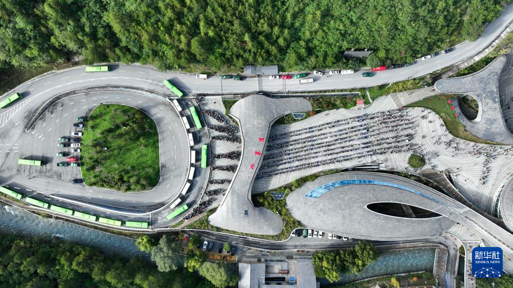 游客排隊(duì)陸續(xù)進(jìn)入九寨溝景區(qū)(2025年10月2日攝,無(wú)人機(jī)照片)。新華社發(fā)(梁楓攝)