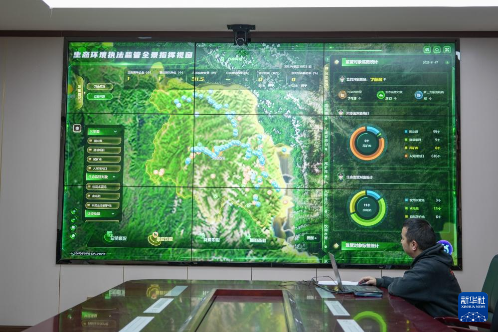 在九寨溝縣生態(tài)環(huán)境局,工作人員在查看生態(tài)環(huán)境執(zhí)法監(jiān)管全景指揮平臺(tái)(2025年11月17日攝)。新華社發(fā)(歐陽(yáng)慧攝)