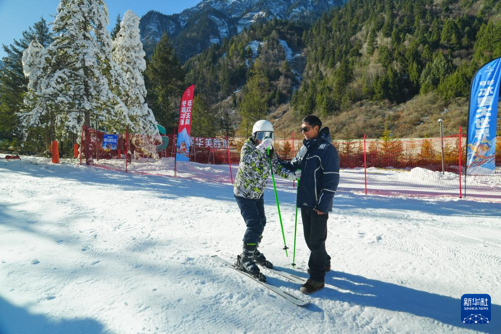 九寨華美勝地度假區(qū)穹恰冰雪大世界工作人員在協(xié)助游客體驗(yàn)滑雪(2025年1月1日攝)。新華社發(fā)
