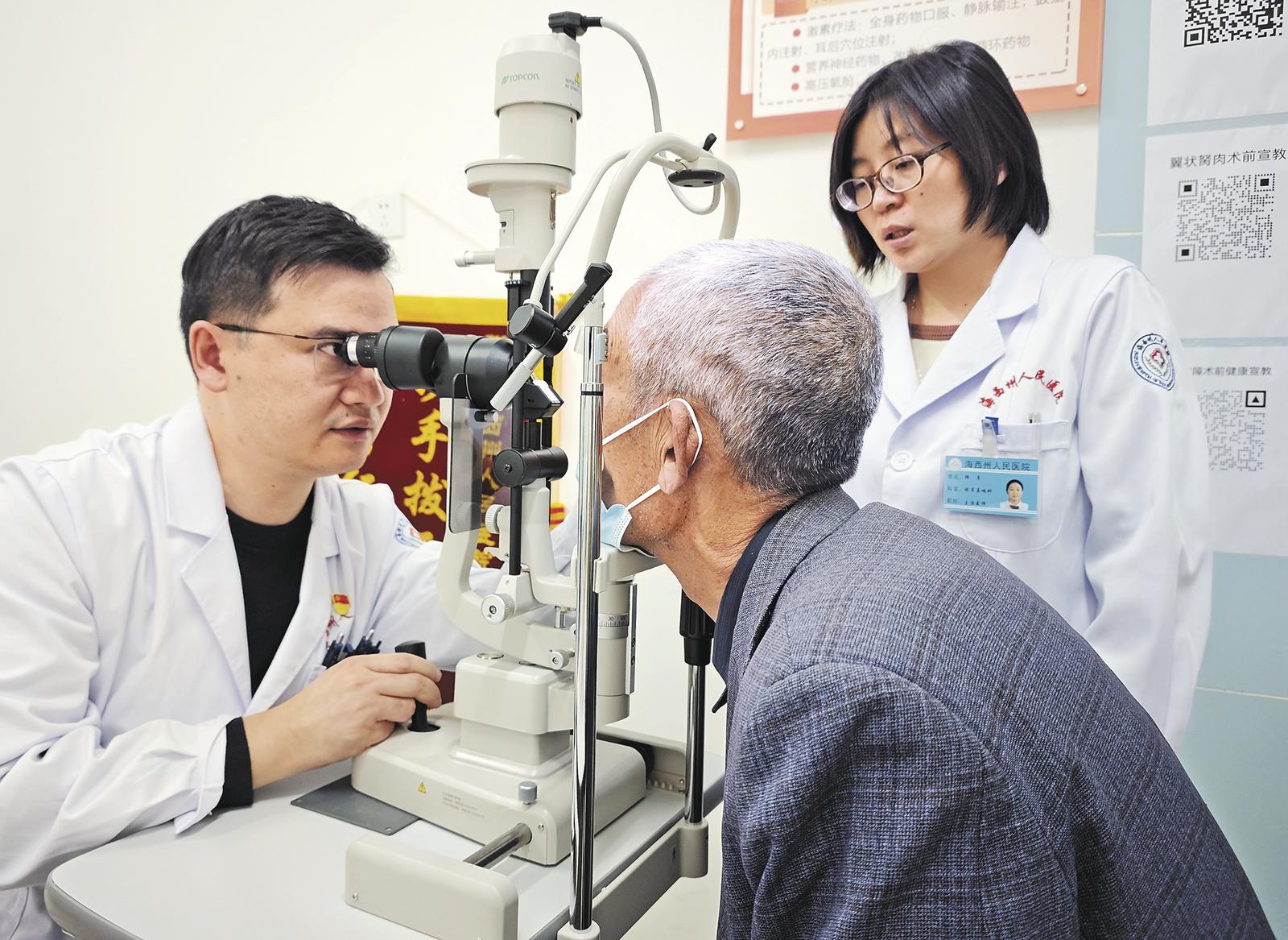 2025年12月26日下午,海西蒙古族藏族自治州人民醫(yī)院門診B015診室里,醫(yī)院眼耳鼻喉科主任、援青醫(yī)生劉輝正專注為一位藏族老人復查眼部情況。因老人不會講普通話,劉輝便借助助理翻譯耐心問診,輔以手勢引導檢測。