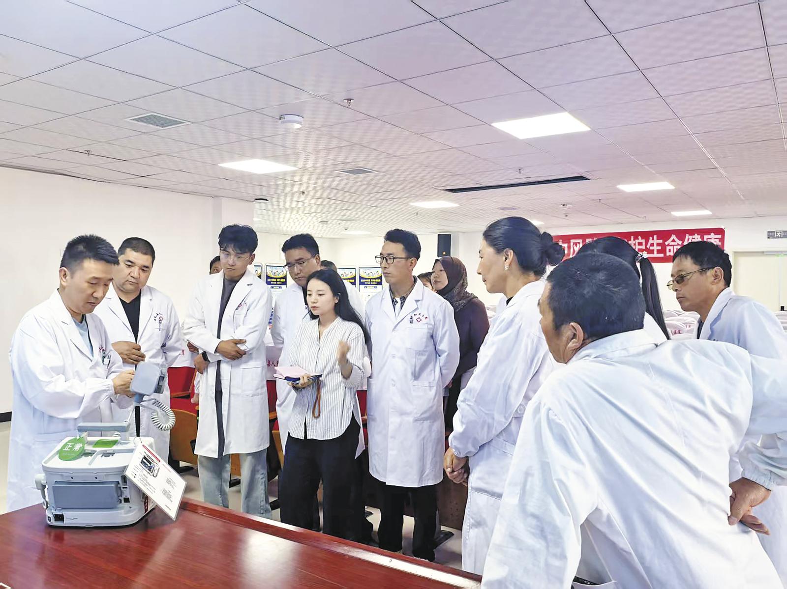 高超醫(yī)生在為基層衛(wèi)生院醫(yī)護人員講解除顫器的使用。