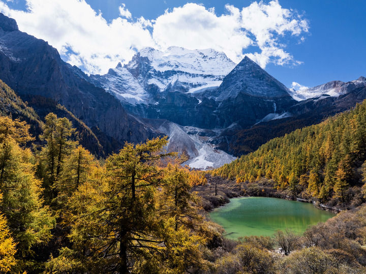 稻城亞丁仙乃日雪山下的湖泊卓瑪拉措掩映在彩林中(2025年10月26日)。新華社記者 江宏景 攝