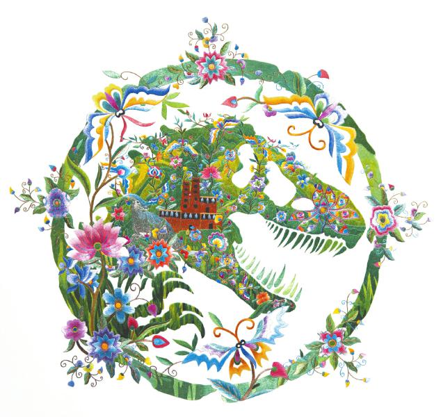 因此,當(dāng)環(huán)球影業(yè)慕名前來(lái)合作時(shí),雙方再次采用產(chǎn)品銷(xiāo)售提成的合作模式。楊華珍為環(huán)球影業(yè)《侏羅紀(jì)世界》系列的恐龍LOGO繡上幾十種花鳥(niǎo)和植物,當(dāng)環(huán)球影業(yè)使用這款LOGO制作文創(chuàng)產(chǎn)品或設(shè)計(jì)動(dòng)漫時(shí),她便可參與分成。