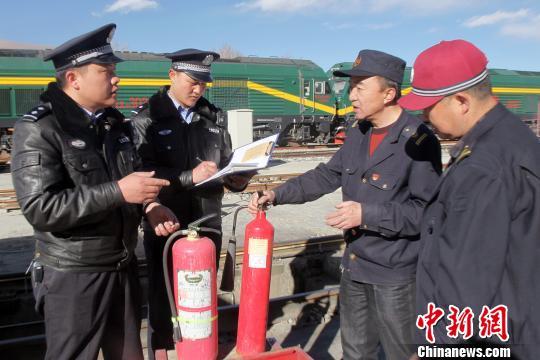 圖為拉薩鐵路公安處民警對(duì)站區(qū)重點(diǎn)部位開(kāi)展消防安全大檢查。 湯成俊 攝