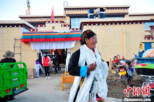2月21日,村民那日在新居門前迎接賓客。那日的新家坐落在西藏拉薩市達孜區(qū)德慶鎮(zhèn)的幸福新村,這是西藏精準扶貧易地搬遷安置點之一。中新社記者 王立林 攝
