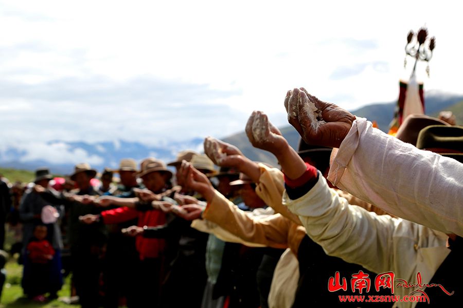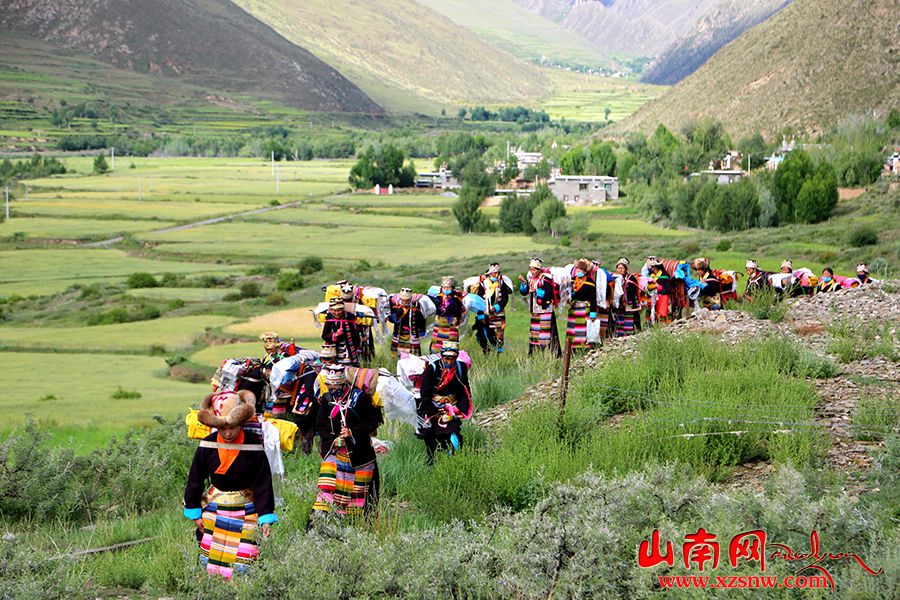7月14日,西藏山南市瓊結(jié)縣拉玉鄉(xiāng)強(qiáng)吉村村民參加“望果節(jié)”祈福。村民們身著節(jié)日盛裝,轉(zhuǎn)遍農(nóng)田,祈求風(fēng)調(diào)雨順好收成?!巴?jié)”已有1500多年的歷史,是國(guó)家級(jí)非物質(zhì)文化遺產(chǎn)。藏語(yǔ)“望”意為“田地”,“果”為“轉(zhuǎn)圓圈”,“望果節(jié)”即圍繞田野歌舞慶祝豐收。(倫珠澤仁攝)