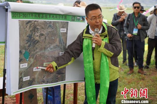 圖為9月3日,“綠哈達(dá)行動(dòng)”西藏公益植草的技術(shù)負(fù)責(zé)人,西藏高原草業(yè)工程技術(shù)研究中心副主任武俊喜在林周縣卡孜鄉(xiāng)草場(chǎng)介紹當(dāng)?shù)厝斯しN草情況。 張偉 攝