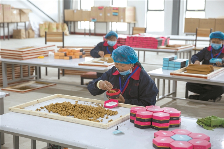 “靠山吃山、靠水吃水”,藏香已成為吞巴村民增收的支柱產(chǎn)業(yè)。圖為吞巴村民在寬敞明亮的現(xiàn)代化廠房內(nèi)分裝藏香成品。孫靖宇攝