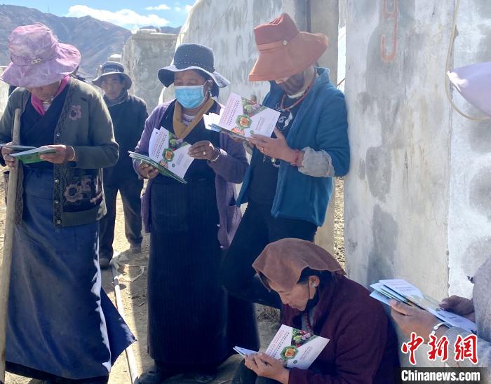 基層菜農(nóng)閱讀西藏自治區(qū)農(nóng)牧科學(xué)院蔬菜研究所技術(shù)人員免費發(fā)放的蔬菜種植技術(shù)手冊。西藏自治區(qū)農(nóng)牧科學(xué)院蔬菜研究所供圖
