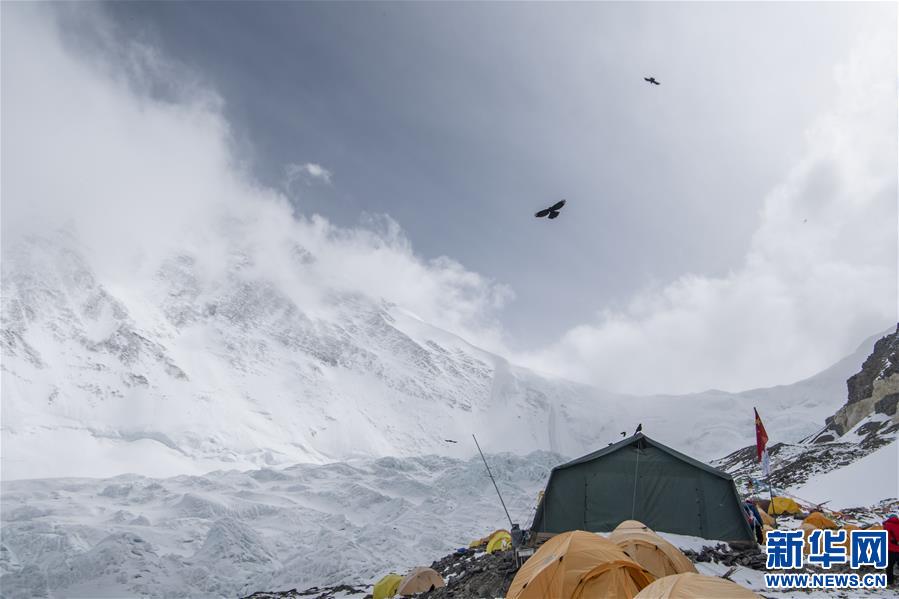 在海拔6500米的珠峰前進(jìn)營(yíng)地,幾只黃嘴山鴉在空中飛翔(5月10日攝)。新華社記者 孫非 攝