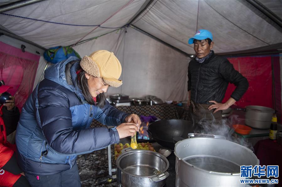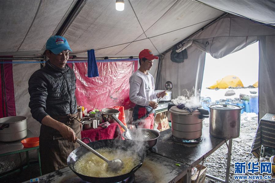 在海拔6500米的前進(jìn)營(yíng)地,高山廚師在準(zhǔn)備菜品(5月10日攝)。新華社記者 孫非 攝
