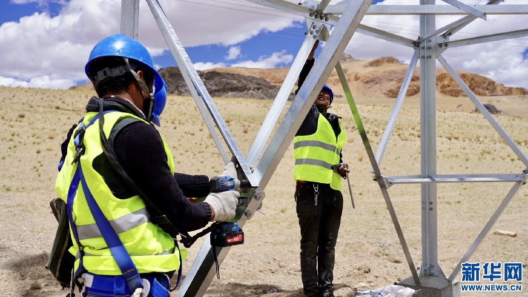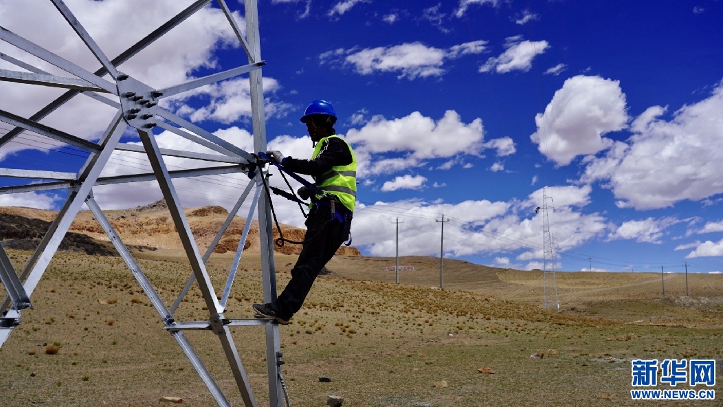 6月25日,西藏措勤縣磁石鄉(xiāng)35千伏輸變電工程現(xiàn)場,電力建設(shè)者正在進(jìn)行輸電線路隱患排查。新華網(wǎng) 達(dá)珍 攝